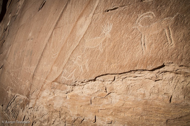 It wasn’t just pioneers that left their mark on the Swell, however, as we soon discovered while dropping into the varicolored canyons of Dragon Wash. Our rocky, plunging jeep road carved ever deeper through layer after layer of ancient sandstone as we dropped toward the eastern edge of the Swell — though it seemed just as likely we were heading to the core of the Earth itself. We lofted our bikes off rock shelves, leaned them through snaking turns, and stopped at virtually every new bend to take in the views. Which was when our expert eyes picked out something unusual on the side of a particularly dramatic wall of rock, just past a protective fence and large sign.